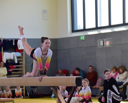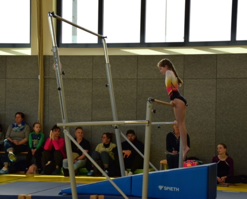 Während alle Mülheimerinnen an den klassischen vier Geräten (Sprung, Stufenbarren, Balken und Boden) ihr Können zeigten, turnten von uns lediglich sieben Mädchen einen regulären Vierkampf; alle anderen kamen an jeweils zwei Geräten zum Einsatz.
