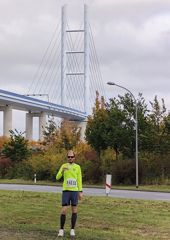 und Tobias Tenbensel lief am Samstag, 11.10., mit knapp 200 Läufer*innen den Marathon beim 17. Rügenbrücken-Marathon. Direkt nach dem Start in Stralsund wartete mit der Überquerung der Rügenbrücke das Highlight. Die Rügenbrücke, die Stralsund mit der Insel Rügen verbindet, gehörte an dem Tag den Läufer*innen. Am höchsten Punkt der Brücke bot sich ein toller Ausblick auf Stralsund, Rügen und die Umgebung. Auf Rügen angekommen, führte die Strecke über Fahrrad- und Wirtschaftswege, sowie Wanderwege über die Insel. Die Landschaft stand beim Marathon im Vordergrund, Stimmungsnester gab es nur vereinzelt. Durch eine gute Renneinteilung konnte Tobias auf der zweiten Hälfte zahlreiche Läufer*innen überholen. Die letzten drei Kilometer über den alten Rügendamm waren mit Wind und Autoverkehr noch mal anstrengend, bevor es für Tobias nach 3:45 Stunden ins Ziel ging.
