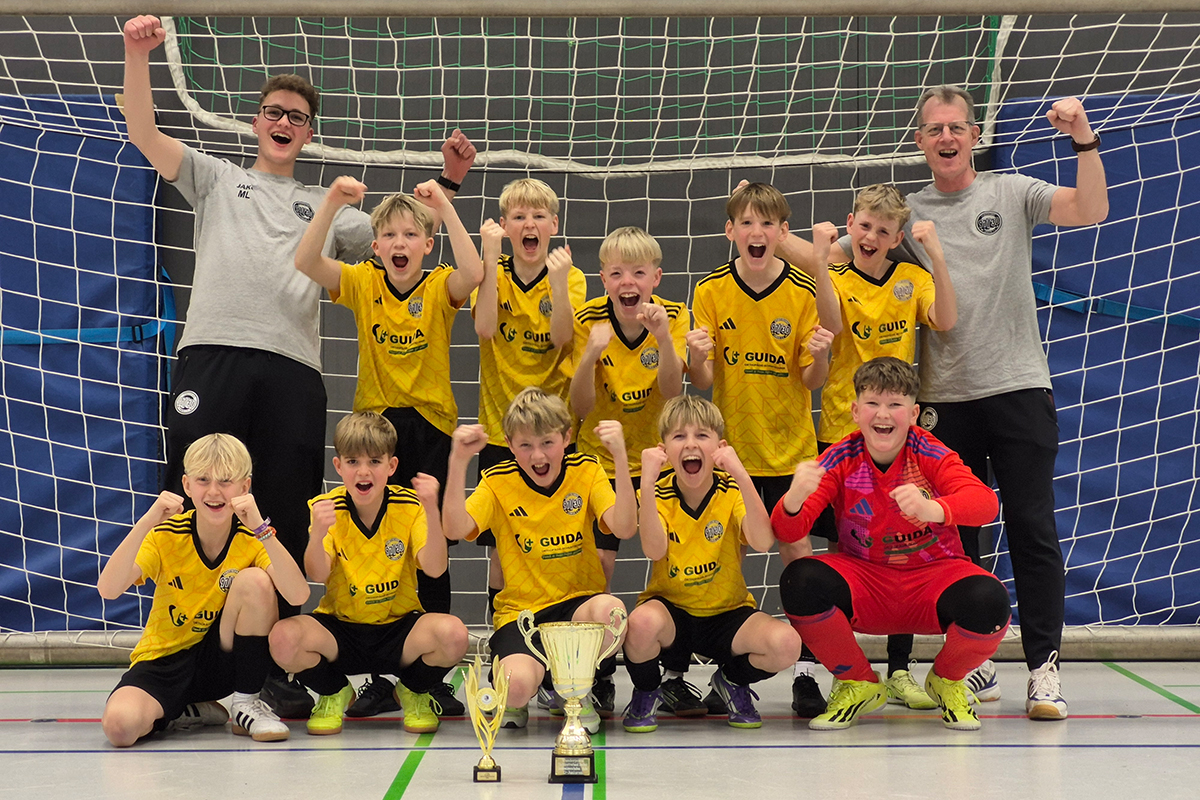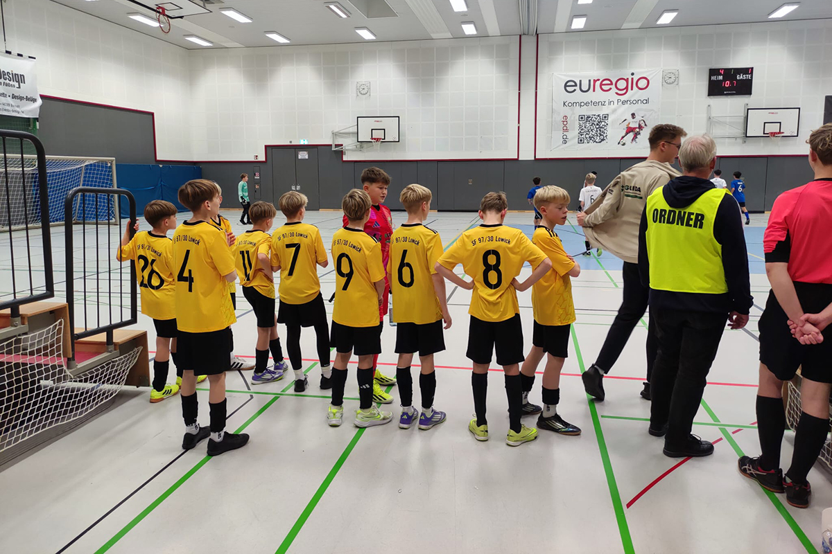 Am Tag vor Silvester fanden die D-Jugend-Stadtmeisterschaften in der Euregio-Halle statt. Daniel und zahlreiche Spieler waren im Urlaub, aber durch den ausgeglichenen Kader hatten wir eine schlagkräftige Truppe am Start. Es wurde in 3 Gruppen mit je 4 Mannschaften gespielt und es qualifizierten sich die beiden Gruppenersten, sowie die beiden besten Gruppendritten und es wurde mit 5 Feldspielern und einem Futsalball gespielt. In der Gruppenphase dauerte ein Spiel 10 Minuten, aber den Finalspielen 12 Minuten. Es war an diesem Tag einiges los und so wird der Tag noch lange in Erinnerung bleiben. Aber der Reihe nach.