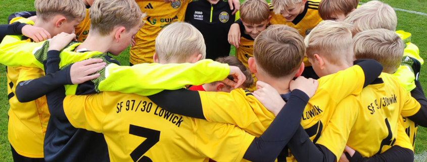 Bis zur dritten Minute waren wir bereits gut im Spiel und hatten auch schon kleinere Abschlüsse, aber dann gab es die kalte Dusche. Nach einem langen Ball der Gastgeber standen wir etwas unsortiert und der Mittelstürmer hatte freie Bahn Richtung Lowicker Tor, zog zur rechten Zeit ab und ließ Leon keine Chance. Danach wurde es für zwei Minuten etwas hektisch, aber dann besannen sich die Gelben auf ihre Stärken und es gab weitere Chancen. In der 5. Minute eroberte Ben K. den Ball im Mittelfeld, zog zum Tor und sein Schuss wäre wohl im Winkel eingeschlagen, wenn der Torhüter nicht mit einer tollen Parade zur Ecke geklärt hätte. Eine Minute später eine schöne Kombination auf der linken Seite. Mit zwei Doppelpässen wurde Tobi freigespielt, zielte aufs kurze Eck, aber erneut war der Torhüter zur Stelle. Nach acht Minuten spielten Jona und Johan auf der linken Seite. Die anschließende Flanke landete bei Ole, aber sein Kopfball war nicht platziert genug. Eine Minute später versuchte Ben K. aus 20 m sein Glück, aber der Torhüter war mittlerweile warmgeschossen, voll im Spiel und konnte auch diesen Schuss entschärfen. Dann aber endlich der hochverdiente Ausgleich. Nach zwei abgewehrten Schüssen landete der Ball am rechten Pfosten bei Okki und er traf aus kurzer Distanz stramm zum 1:1. Vor dem Spiel sagte Malte noch: „Ole schießt heute ein Tor!“ und in der 17. Minute sollt er recht behalten. Und es war ein Tor, das dem Trainerteam in der Entstehung das Herz aufgehen ließ. Leon hatte den Ball und Jona kam aus der gegnerischen Hälfte auf Leon zugelaufen. Jonas‘ Gegenspieler lief mit und dadurch war auf dem linken Flügel viel Platz. In diesen Raum lief Tobi, er bekam den langen Ball von Leon und marschierte Richtung Weseler Tor. Er wurde fast noch gefoult, blieb aber auf den Beinen und passte in die Mitte auf Ole, der sofort abschloss und das 1:2 erzielte – Spiel gedreht. In der 23. Minute gab es einen Freistoß und Okki nahm Maß: