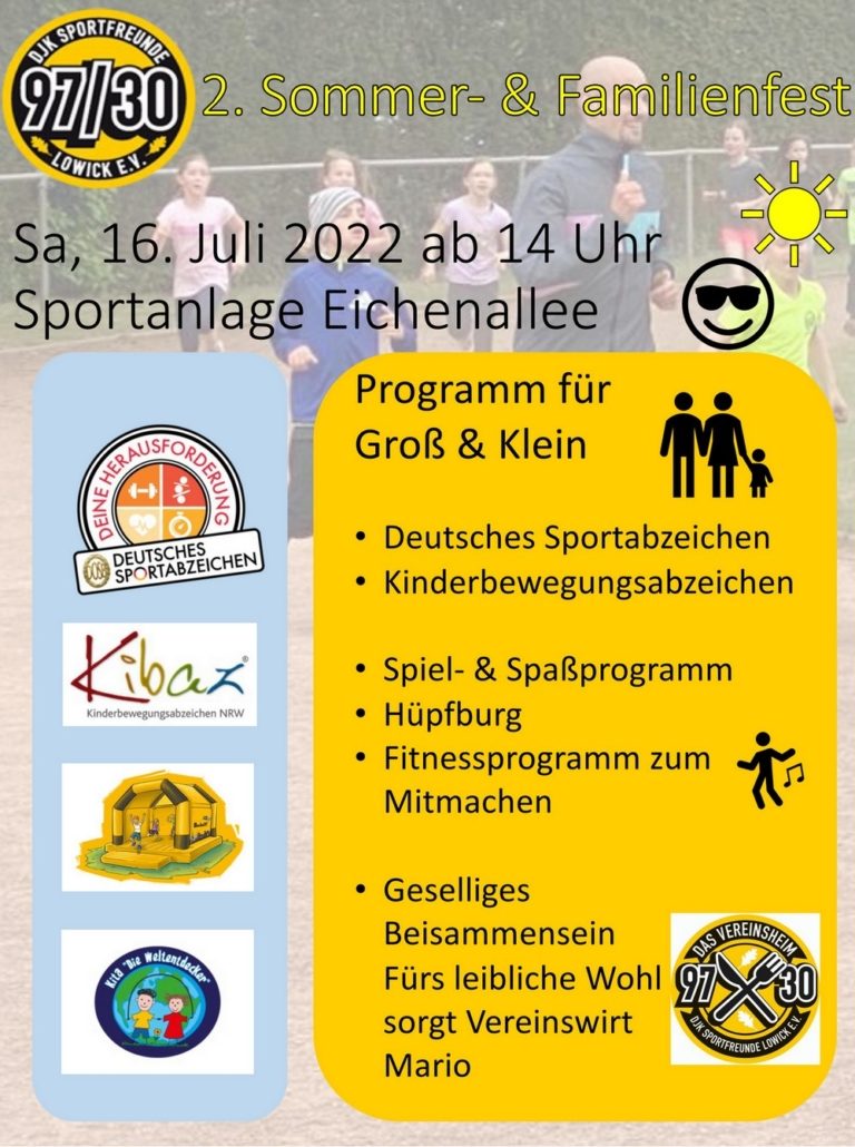 Zum 2. Mal findet am Samstag, 16. Juli 2022 auf dem Vereinsgelände der DJK Sportfreunde 97/30 Lowick an der Eichenallee das große Sommer- und Familienfest statt. Für Groß und Klein und sowohl für Mitglieder als auch für Nichtmitglieder wird wieder ein buntes und abwechslungsreiches Programm geboten, das keine Wünsche offenlässt.