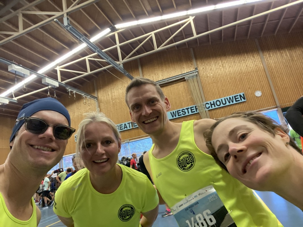 Am Samstag, 04.10.2025 um 12:00 Uhr mit dem zwölften Glockenschlag der Dorfkirche erfolgte der Start mitten in Burgh-Hamstede. Von dort aus liefen wir nach einer kurzen Passage durch das Dorf in das erste Naturschutzgebiet hinein. Hier konnte man die Landschaft genießen und locker ins Rennen hineinkommen. Daraufhin folgte der erste kurze Strandabschnitt. Auf Grund der Flut mussten wir durch den weichen Sand laufen und wir bekamen einen ersten Eindruck vom Wind und dem bis dahin unbekannten Gegner „fliegender Sand“. Der nächste Abschnitt führte uns über die Sturmflutwehre. Wunderschön zu laufen als breite Asphaltstraße und Wasser auf beiden Seiten, aber an diesem Tag auch ohne Windschutz. So traf der Wind uns hier immer von schräg vorne. Den Wind zu spüren, wie er einen immer zur Seite drückt war sehr beeindruckend und raubte auch hier schon erste Kräfte. Im Anschluss dreht die Strecke so, dass der Wind frontal von vorne kam. Hier war die Taktik klar: Laufen bei solchen Bedingungen ist Teamsport. Wir suchten uns alle Gruppen in denen wir mitlaufen konnten, um nicht alleine gegen den Wind kämpfen zu müssen. Der zweite lange Strandabschnitt war in der Gruppe und rückläufigem Wasser überraschend gut zu laufen. Jedoch kosteten die Bedingung Kraft, sodass sich die weiteren Anstiege in den Dünen deutlich härter anfühlten und der anhaltende Wind von vorne oder der Seite weitere Körner kosteten. An diesem Tag war entscheidend, dass die Einstellung bei allen stimmte und zwischen kämpfen und genießen lag. Diese führte zu einem breiten Lächeln bei allen Finishern.