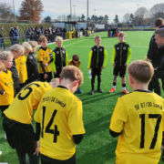 In den ersten Minuten änderte sich an den Spielanteilen nichts und in der 38. Minute die Vorentscheidung. Doppelter Doppelpass zwischen Johan und Tobi, Johan zog zur Grundlinie und passte in den Rückraum. Ein Verteidiger war noch mit einem langen Bein am Ball, aber dieser fiel dann Okki vor die Füße und er fackelte nicht lange und traf zum 4:0. Was war denn hier los? In der 43. Minute die erste echte Chance für die Gäste. Sie konterten schnell und hatten 2-gegen-1 Überzahl. Aber wir stellten den Passweg zum Mitspieler zu, der Emmericher zog ab, aber sein Schuss war weder hart, noch platziert. Aber es gab auch weiterhin gute Chancen für die Gelben. Toller Pass in die Gasse von Johan auf Ben B., aber sein zweiter Ballkontakt war nicht sauber und der Torhüter war vor ihm am Ball. Dann zwei weitere Chancen. Erneut Johan auf Ben B. und dann eine Chance für Ben K. Beide Chancen blieben aber ungenutzt. Zehn Minuten vor dem Ende Ballgewinn am eigenen Strafraum und Ballverlust im eigenen Strafraum. Beim nächsten Zweikampf kam der Emmericher zu Fall und es gab Strafstoß. Dieser wurde für Leon unhaltbar zum 4:1 versenkt. In der 53. Minute wurde Janno nach gutem Pressing freigespielt, aber er hatte wohl zu viel Zeit zum Nachdenken und verzog neben das Tor. Und falls die Gäste nach ihrem Treffer noch einmal Hoffnung geschöpft hatten, erstickte diese Ben v. d. S. im Keim. Ecke von Okki von der linken Seite zentral vors Tor, Klärungsversuch zentral vor das Tor. Dort stand Ben völlig frei und mit Anlauf nahm er Maß und netzte ein.