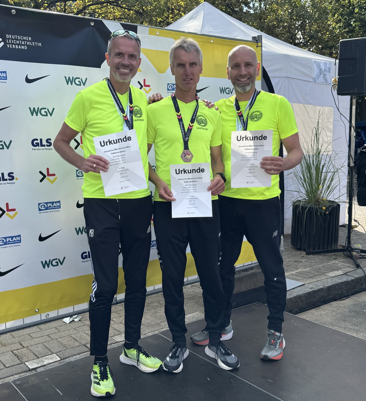 Auch die Männer aus Lowick konnten sich eine Medaille sichern: Das Team M50/60 holte in einem sehr starken Feld die Bronzemedaille in der Teamwertung. Friedhelm Betting führte das Team mit einer herausragenden Zeit von 1:26:29 Stunden an, was ihm den 6. Platz in der AK M60 einbrachte. Zweitschnellster war Philipp Grunewald der trotz einer Verletzung in der Vorbereitung eine gute Performance bot und mit 1:36:10 Stunden finishte. Komplettiert wurde das Team von Martin Brandenburg der kurze Zeit später nach 1:36:35 ins Ziel kam und somit für den überraschenden Gewinn der Bronzemedaille sorgte.